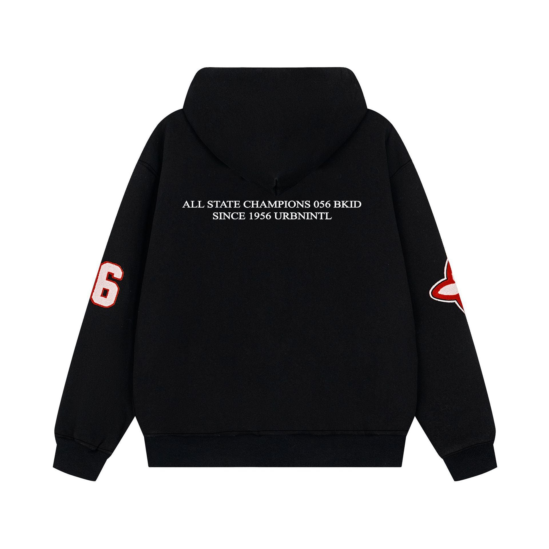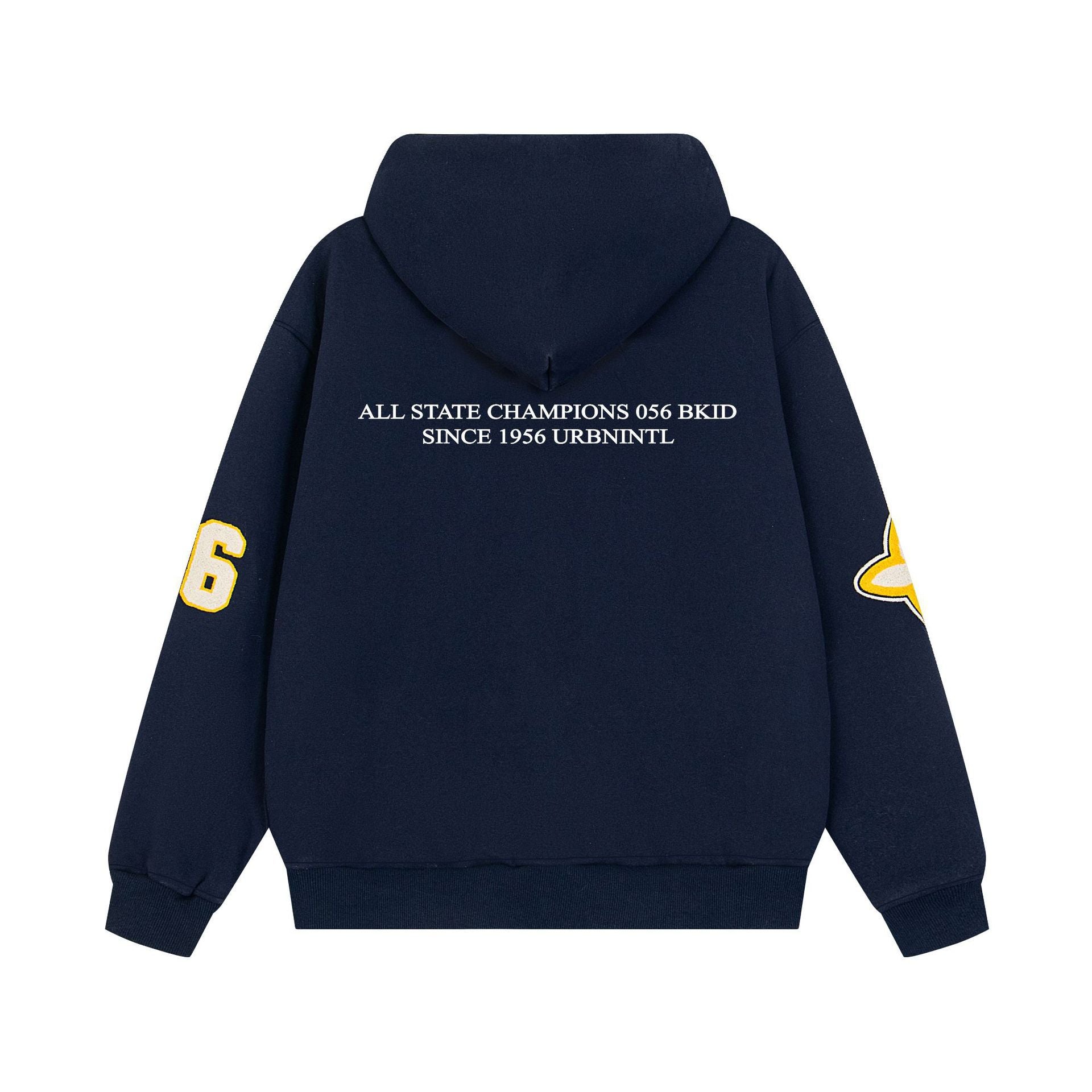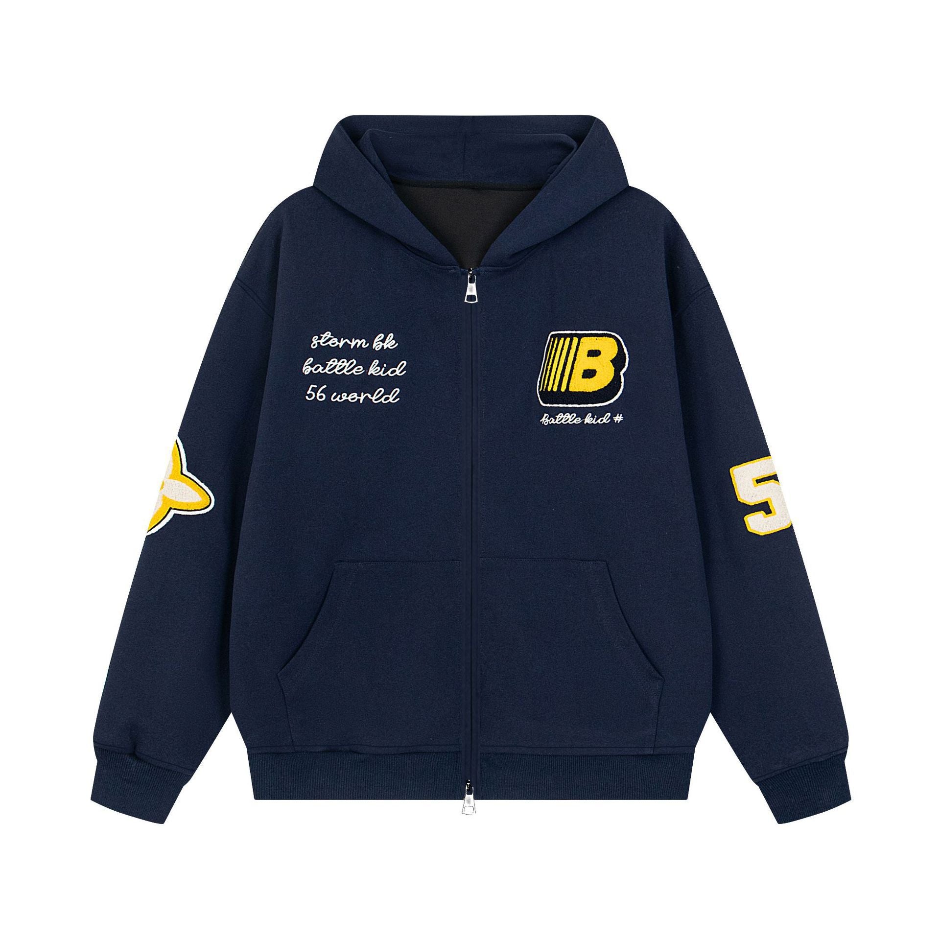 胸元や袖にロゴ・ナンバー・ワッペン風刺繍が施された、スポーティーな雰囲気たっぷりのジップアップパーカー。3色(ブラック・カモフラージュ・ネイビー)展開で、どれもカジュアルコーデやストリートスタイルの主役になるアイテムです。