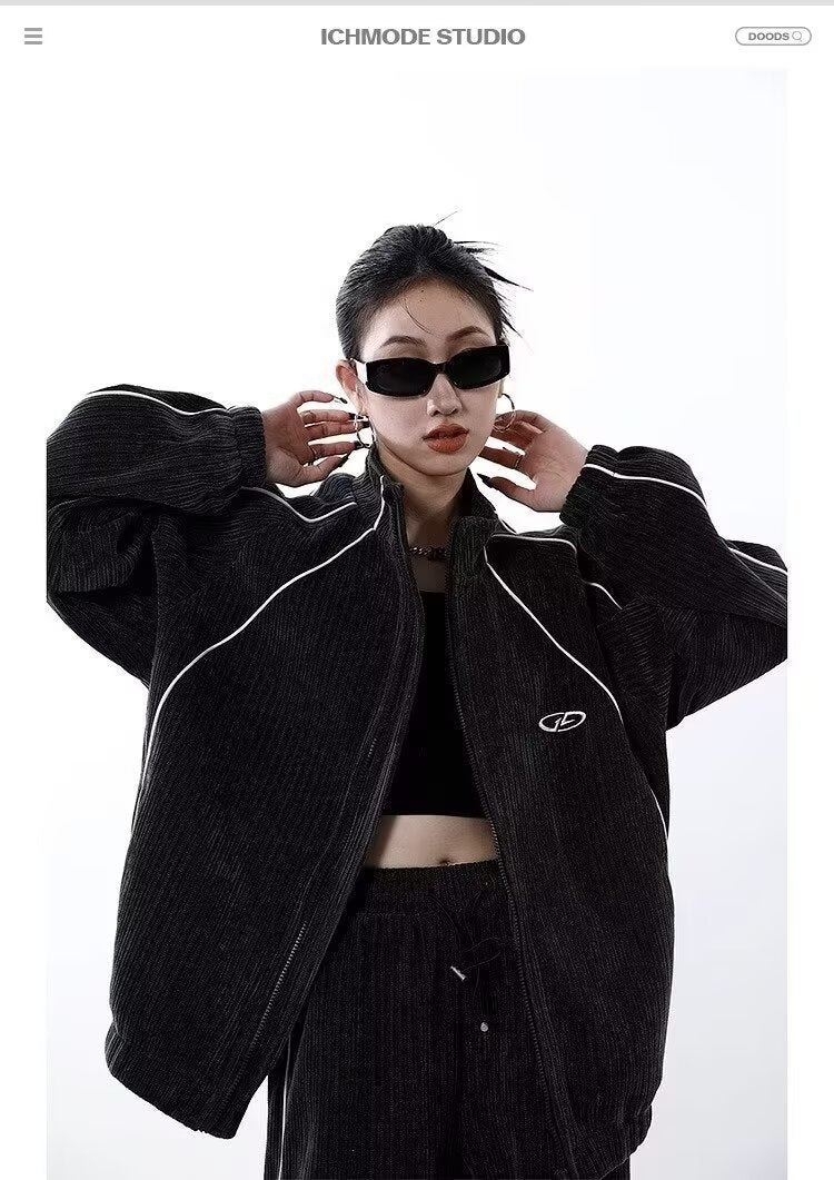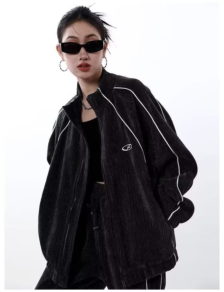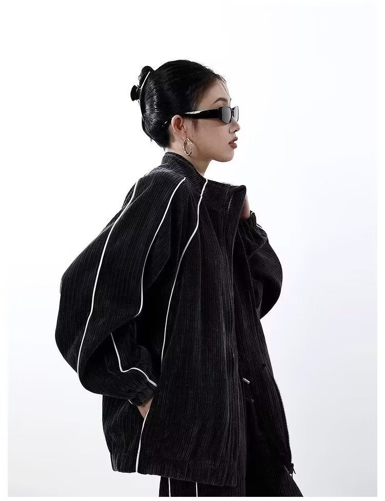 軽やかなストライプの襟と短めのシルエットが特徴のジャケット。秋冬にぴったりなゴールドのアクセントが、レトロなカジュアルスタイルに遊び心をプラスします。男女問わず楽しめるデザインなので、カップルや友達とおそろいコーデもおすすめです。デイリーにさっと羽織って、新しい季節を楽しく迎えましょう!