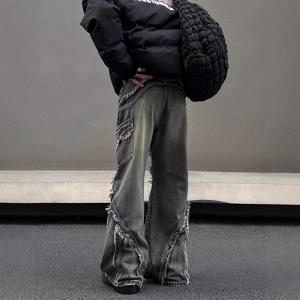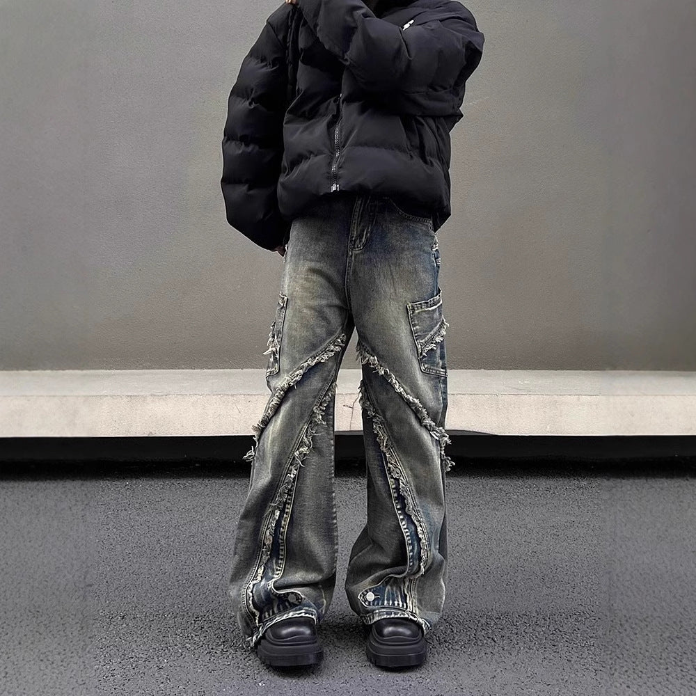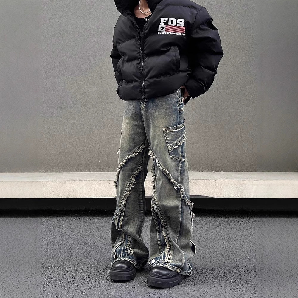 フリンジとダメージ加工がアクセントのジーンズは、個性的なストレートシルエットでスタイルをアップデート。マイクロラッパーデザインがユニークな雰囲気をプラスし、ワークウェア感のある洗い加工が味わい深さを演出します。遊び心あふれる一着で毎日のコーデに楽しさを!