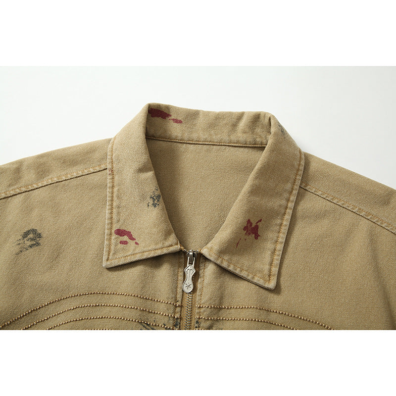 トレンドのヴィンテージテイストと大胆なアートペイントデザインが融合した、ストリート系ベージュジップアップジャケット。フロントの大きなプリントが目を惹き、個性的なコーディネートに最適な一着。ゆったりとしたユニセックス仕様で、メンズ・レディース問わず着用可能。春秋のライトアウターとして、ロンTやパーカーの上からも羽織れる万能ジャケットです。デニムやジョガーパンツとの相性も抜群!