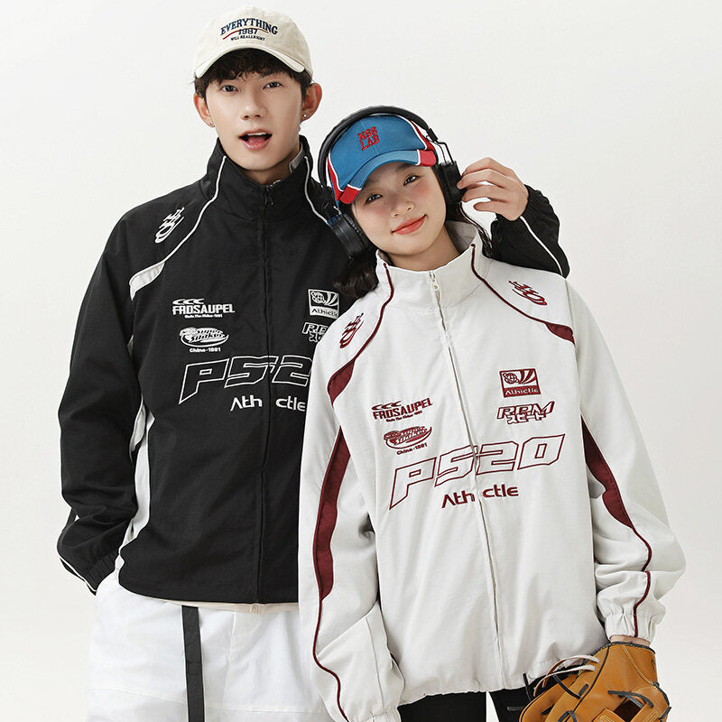 レーシングモチーフの刺繍やロゴデザインがアクセントになった、レトロスポーツテイストのトラックジャケット。さらっと羽織れる軽やかな素材感で、カジュアルにもストリートにもマッチ。男女問わず楽しめるユニセックス仕様です。
